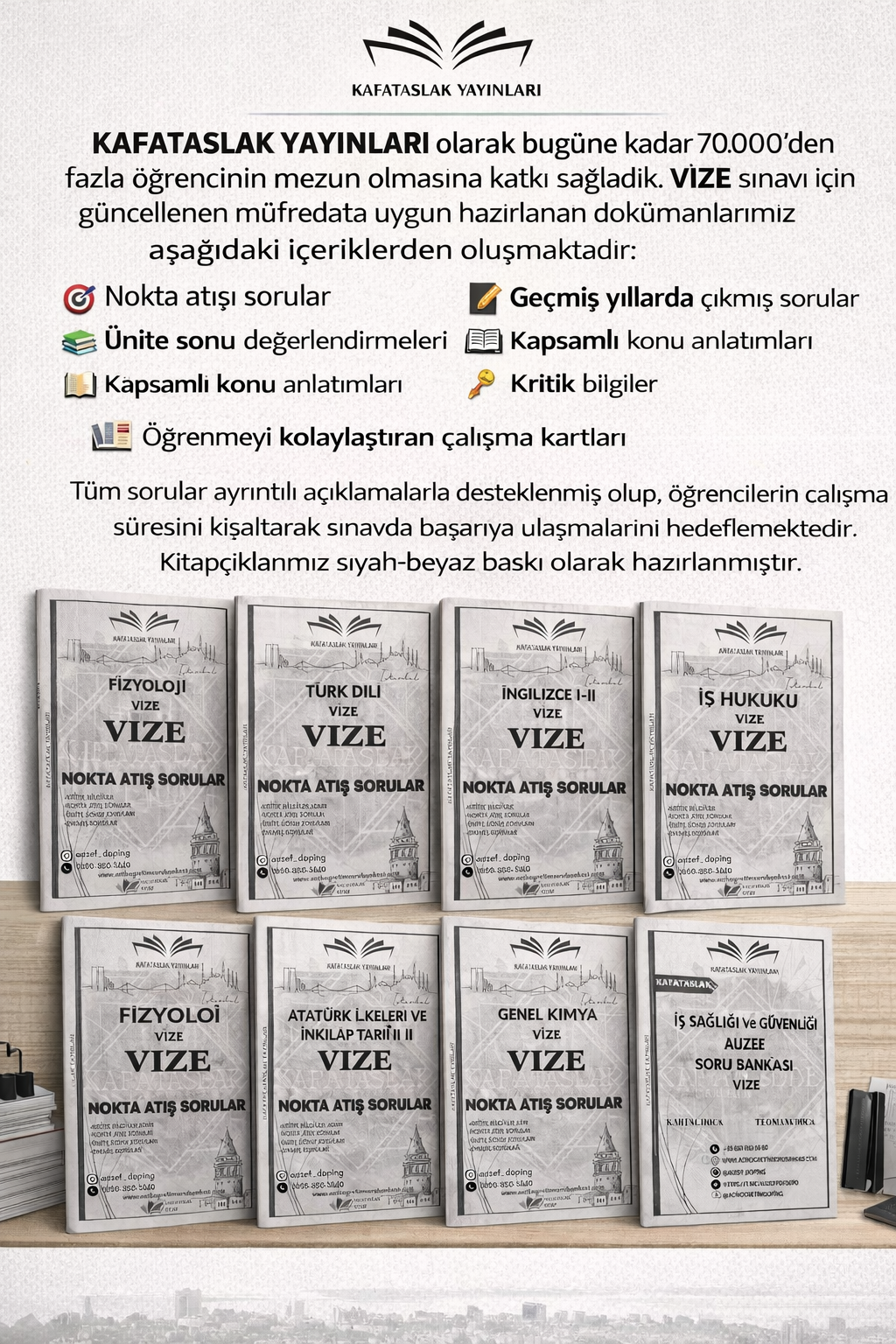Kafataslak Kitap, öğrencilere sadece sınavları geçmelerini sağlayacak bilgileri sunmaz; aynı zamanda sınavlarda yüksek not alarak fark yaratmalarına yardımcı olur. Sınav sürecindeki stres ve kaygıyı azaltan etkili çalışma teknikleri ve içeriğiyle, öğrencilerin başarıya giden kestirme yolu keşfetmelerine olanak tanır. Kapsamlı ama anlaşılır bir dilde hazırlanan dokümanlarımız, öğrencilerin çalışmaya daha motive bir şekilde yaklaşmalarını sağlar.